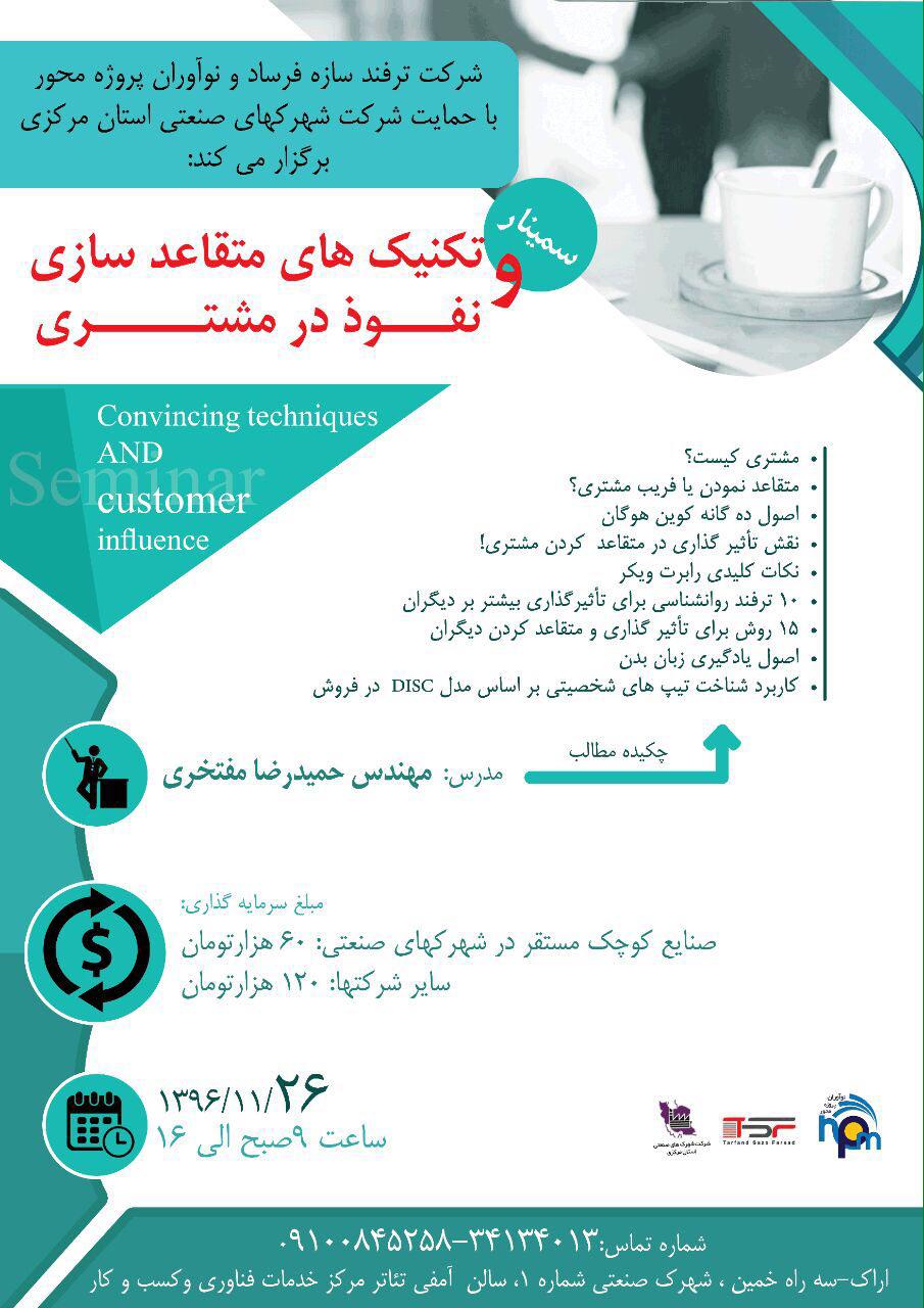 برای دومین بار دراستان مرکزی سمینار تکنیک های متقاعد سازی و نفوذ در مشتری با استقبال پرشور شرکت های صنعتی در شرکت های شهرک صنعتی اراک برگزار گردید.